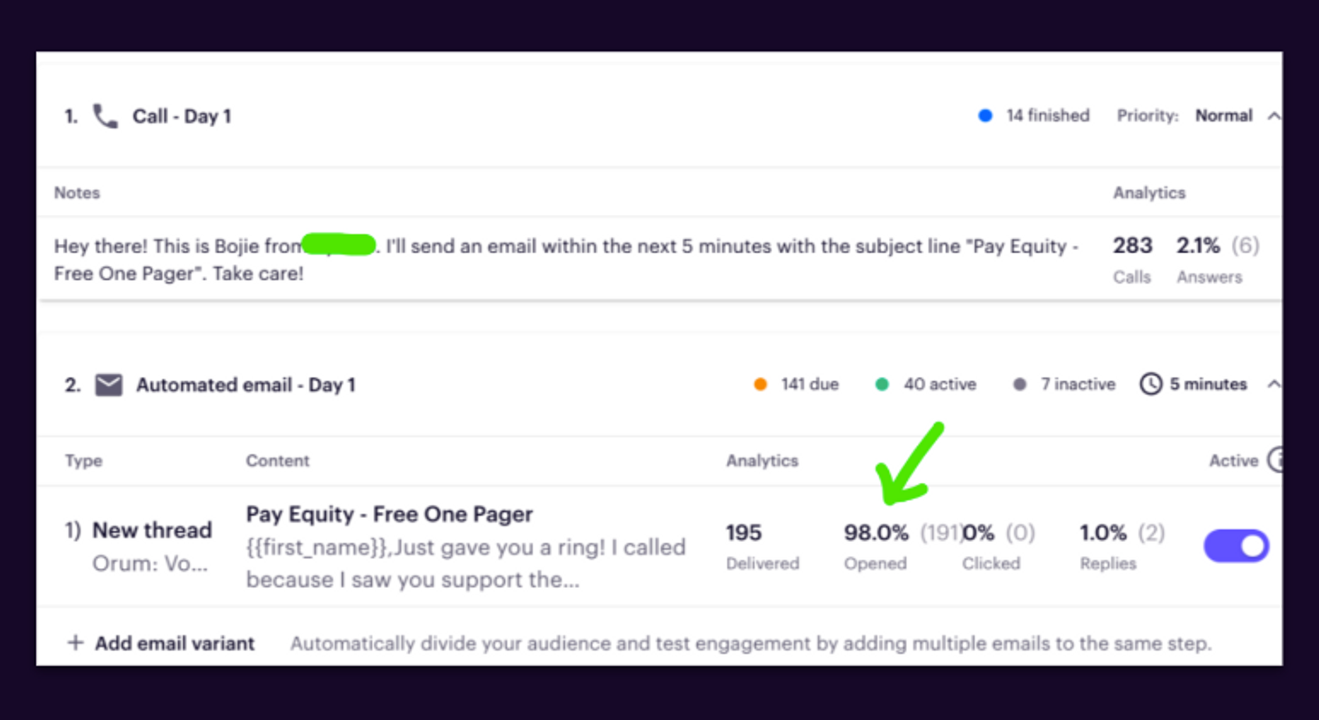 Below is a real example of a rep achieving incredible open rates by being strategic with Orum’s Voicemail Sequencer. The rep isn’t lifting a finger to leave the voicemail hands-free or send the automated email 5 minutes later but can still tell the prospect the subject of the automated email on the way.