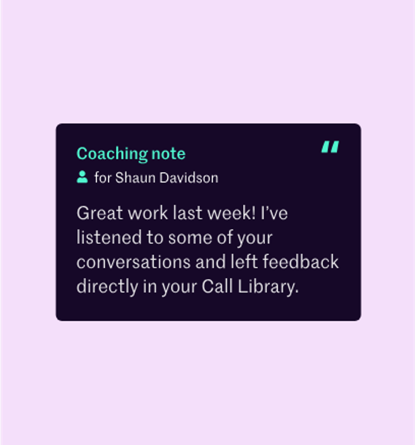 For example, if you set a goal for a team member to boost their connect-to-conversion rate, you could send them an automated message tracking their progress after a successful call. You can also create real-time feedback loops to help drive continuous improvement.