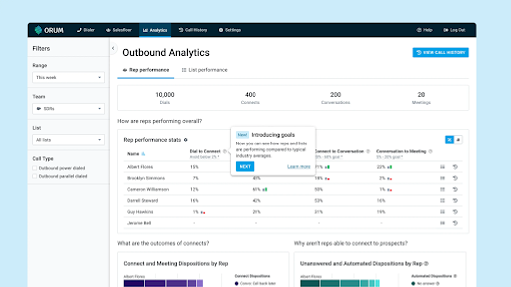 So, as your SDR progresses, call analytics become increasingly important. Orum uses the milestones you set to help you give reps automated, personalized feedback.