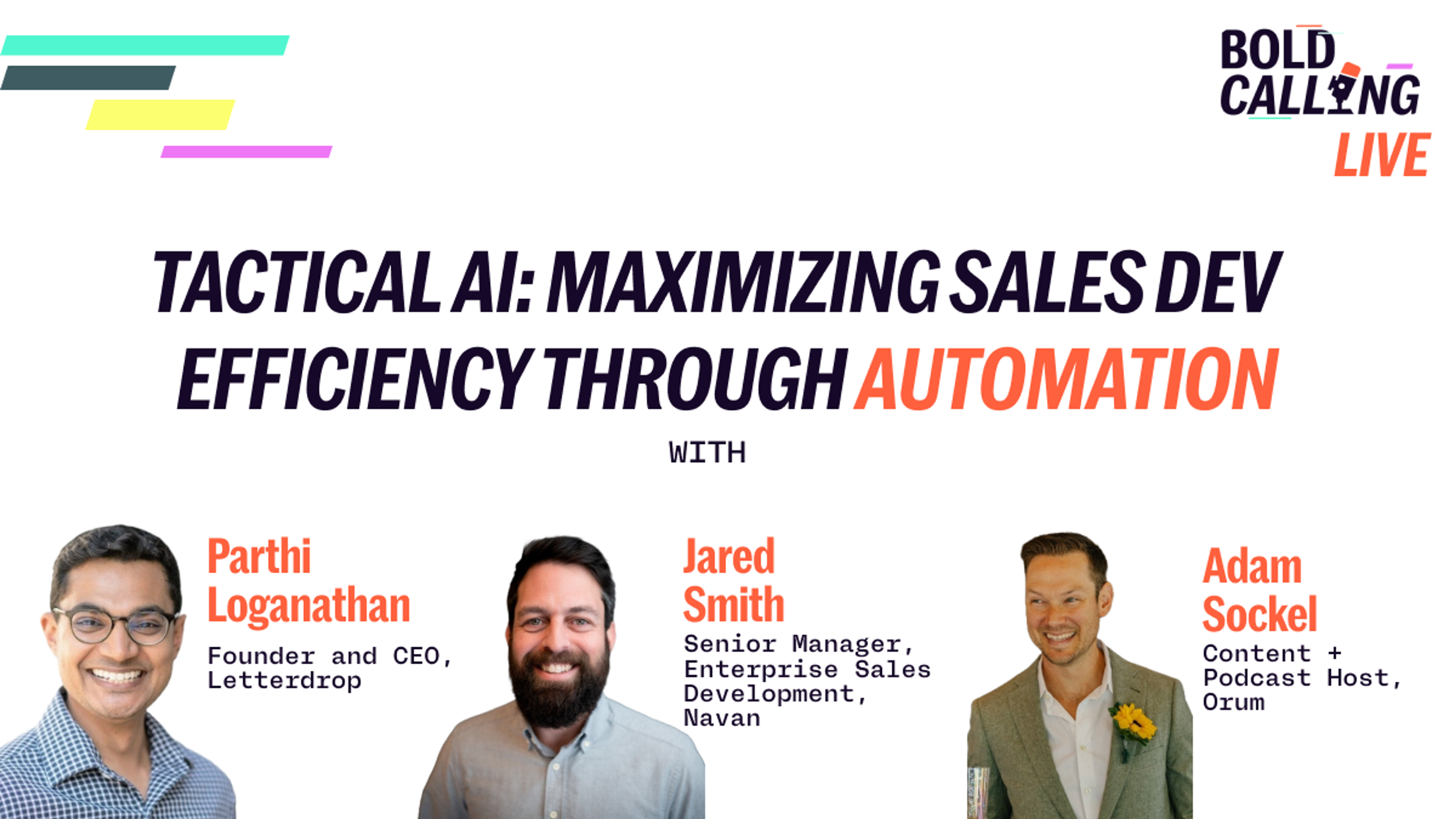 Recently, Adam Sockel, host of Orum's Bold Calling podcast, was joined by Parthi Loganathan, CEO at Letterdrop, & Jared Smith, Senior Manager of Enterprise Sales Development at Navan to discuss Orum's recently released AI in Sales Development report.