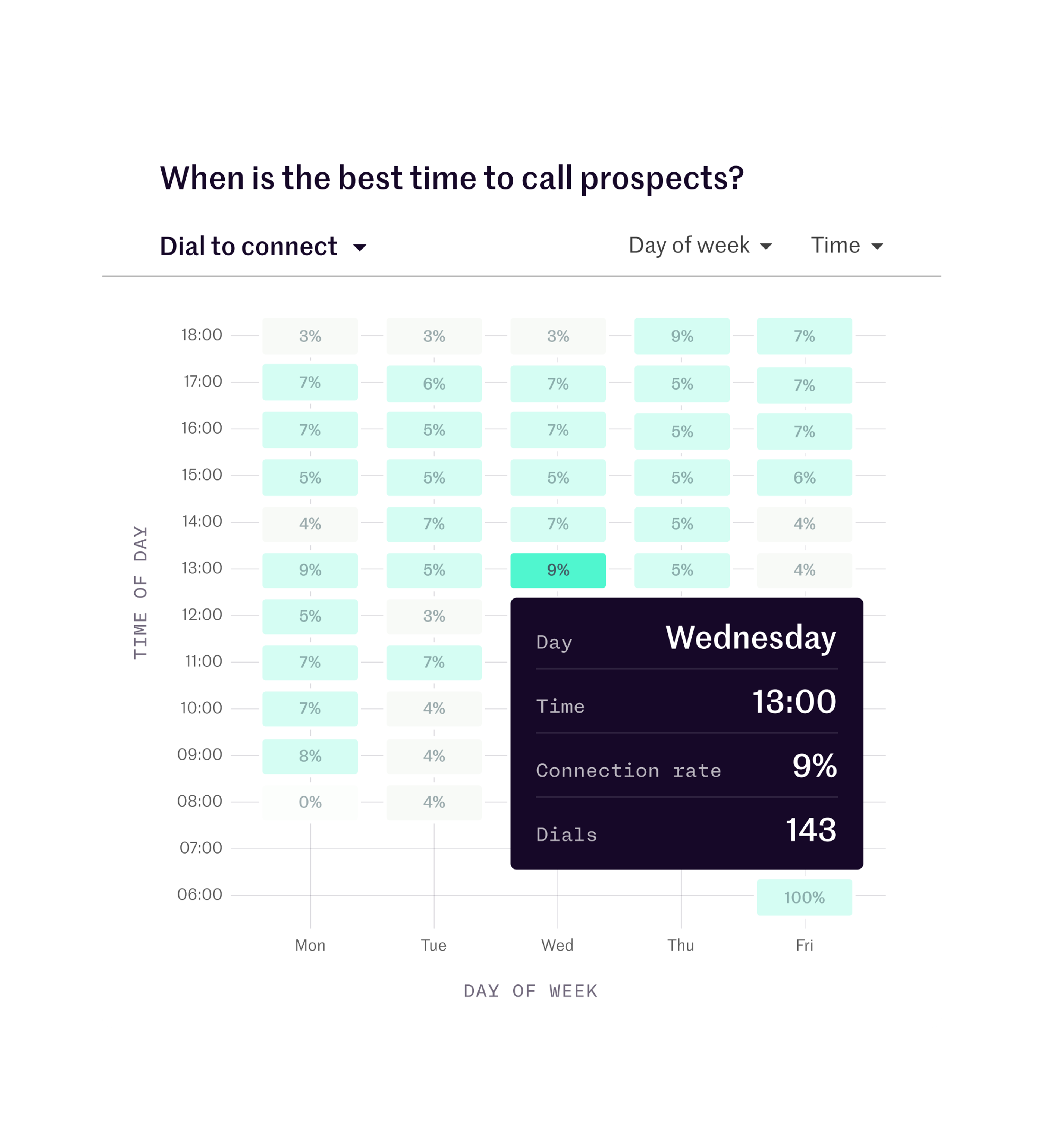 Leverage call data to uncover the best times during the week to call prospects, and ensure that your reps are optimizing their dialing time.