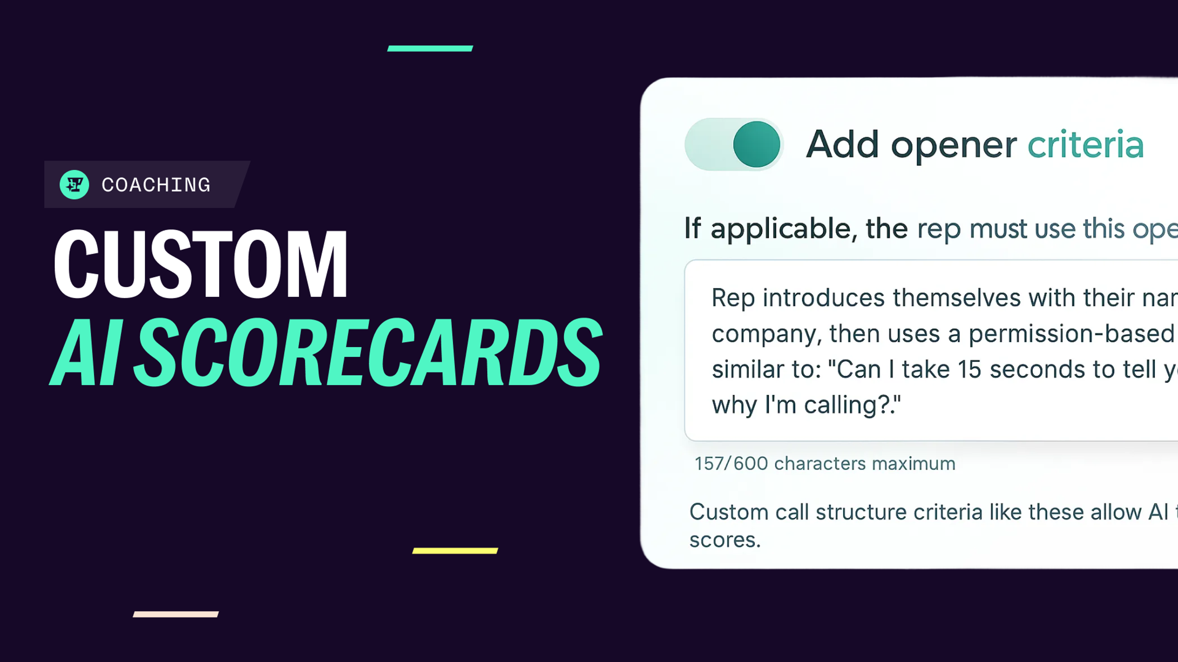 The next step? Turn that knowledge into criteria your AI can score, and your reps can actually improve on. This is where most managers fall short. They know what “great” sounds like, but they can’t operationalize it.