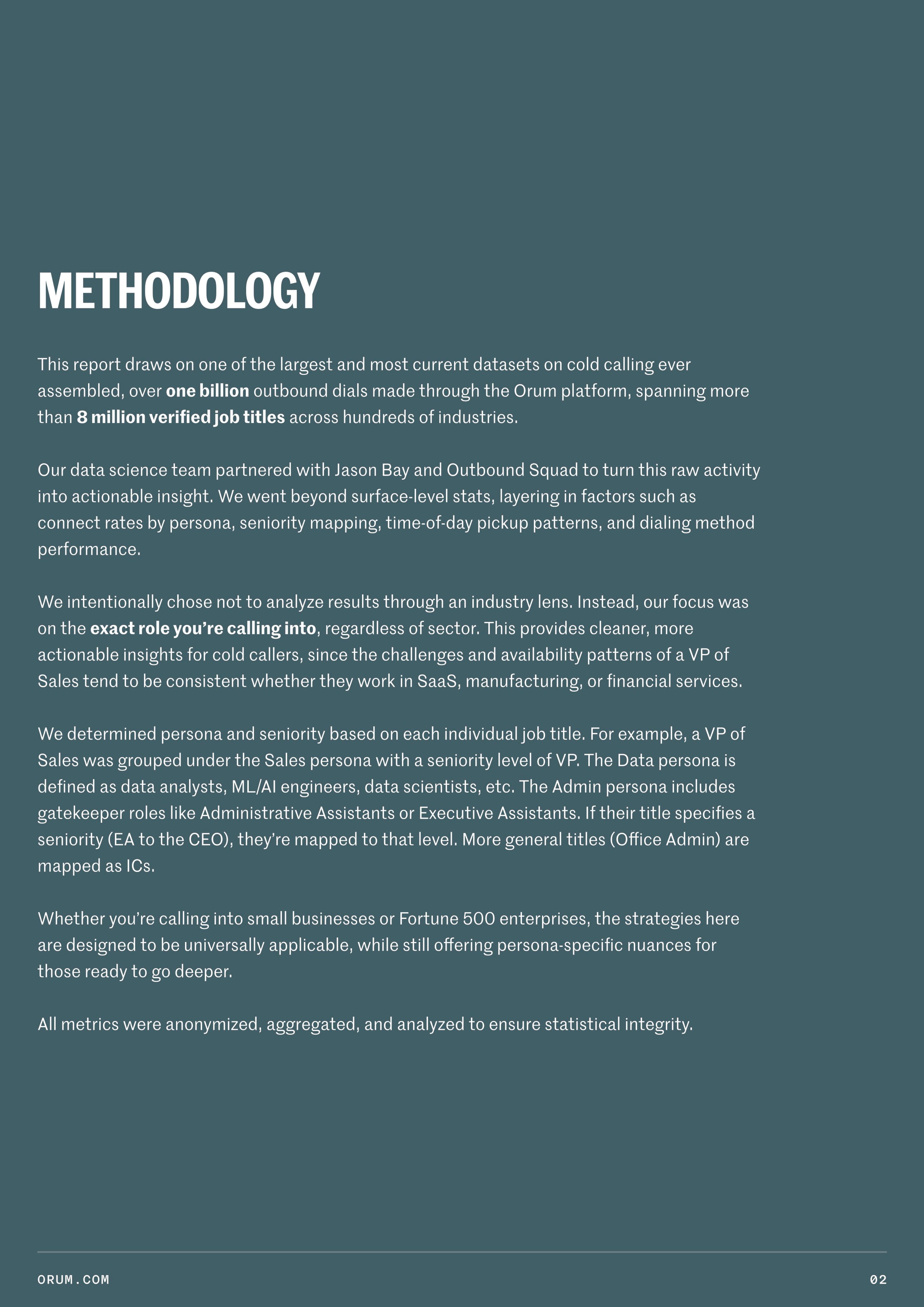 This report draws on one of the largest and most current datasets on cold calling ever assembled, over one billion outbound dials made through the Orum platform, spanning more than 8 million verified job titles across hundreds of industries. We partnered with Jason Bay and Outbound Squad to turn this raw activity into actionable insight.