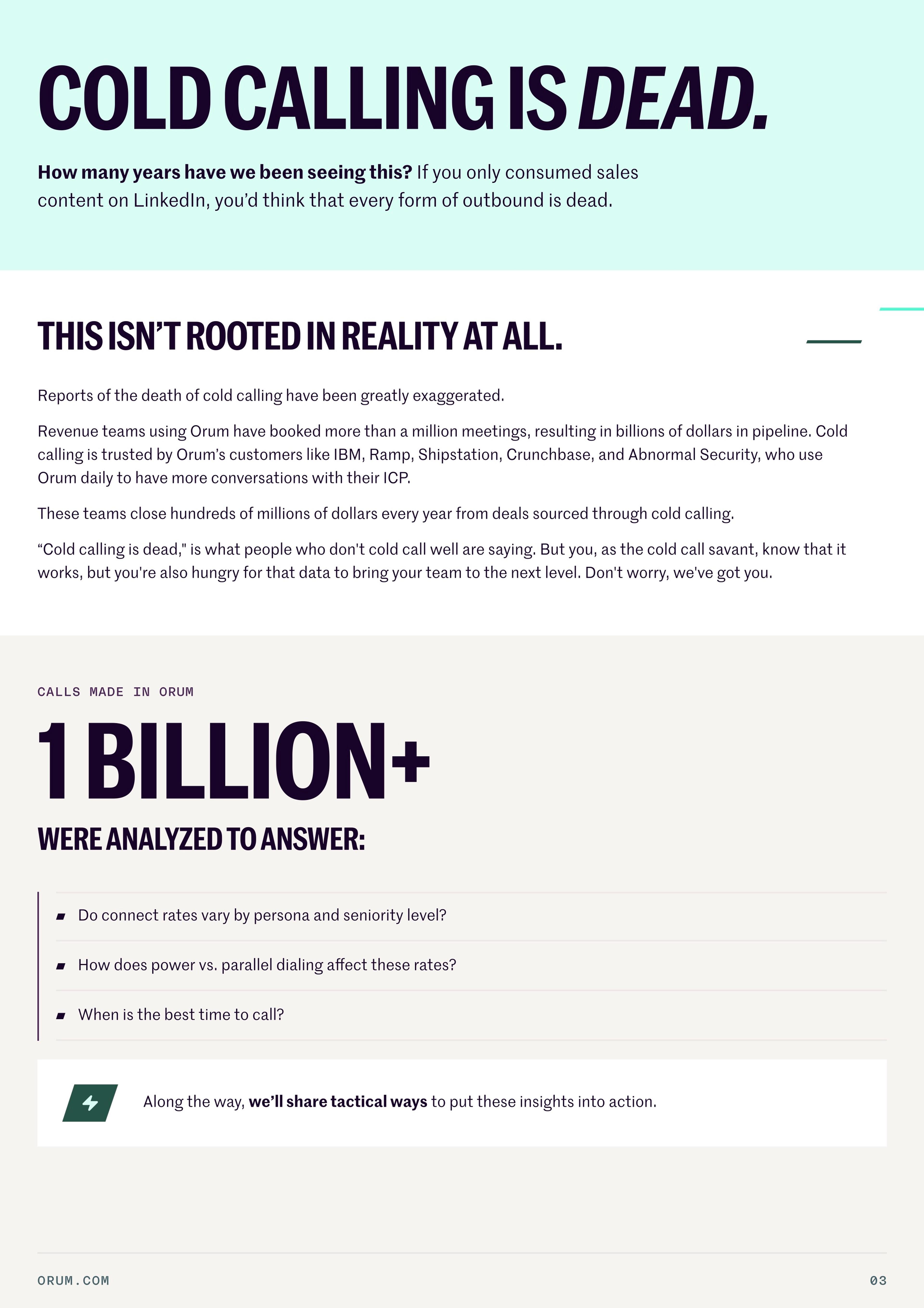 That’s why we created Orum’s State of Cold Calling Report. Backed by insights from over 1 billion calls, it answers the questions every sales leader is asking: